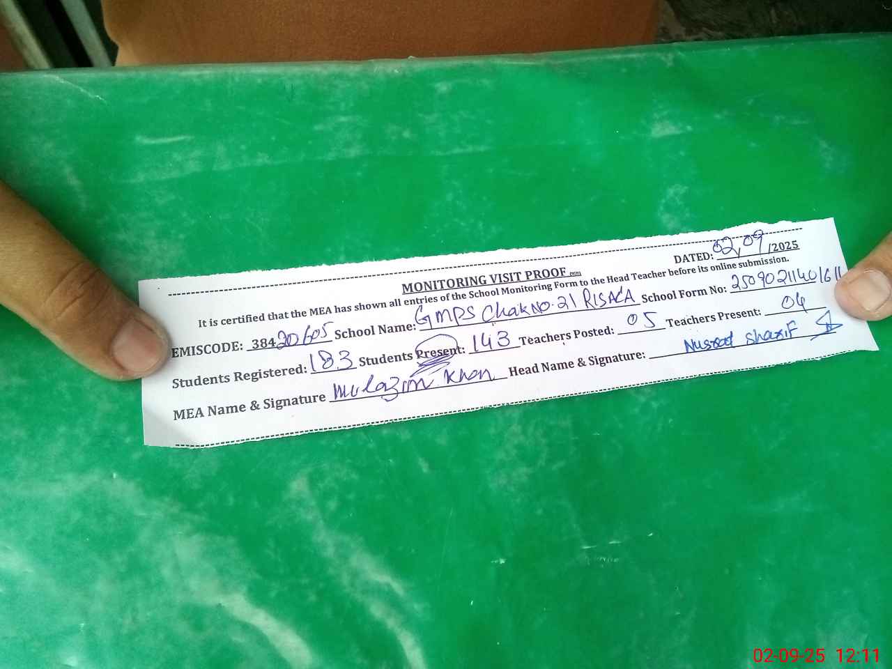 | Attendance Register | Head Teacher | MEA with School | Visit Proof |