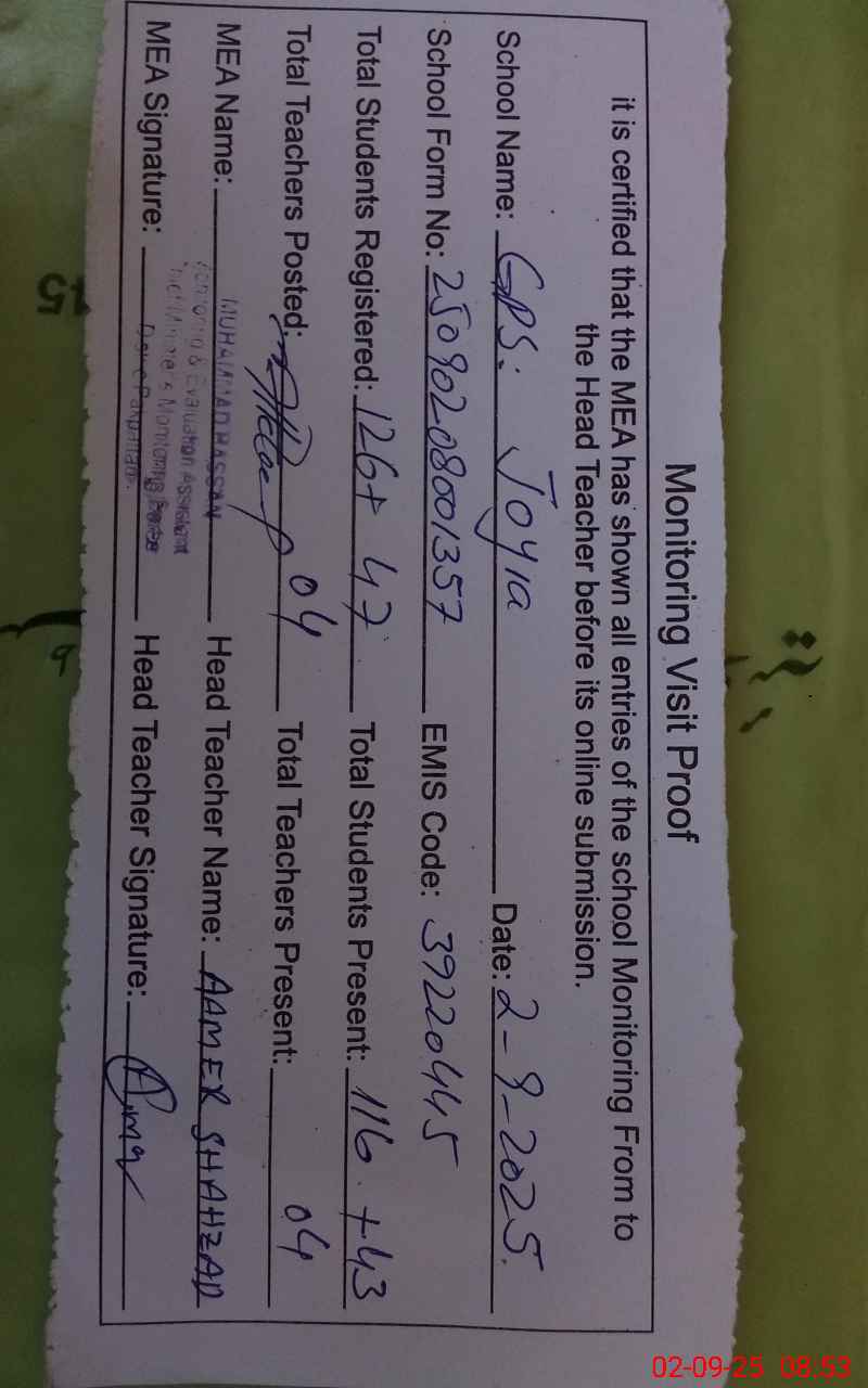 | EMIS Code: 39220445 | Name of School: GPS JOYIA P.O NOORA PATH ARIF WALA | |||