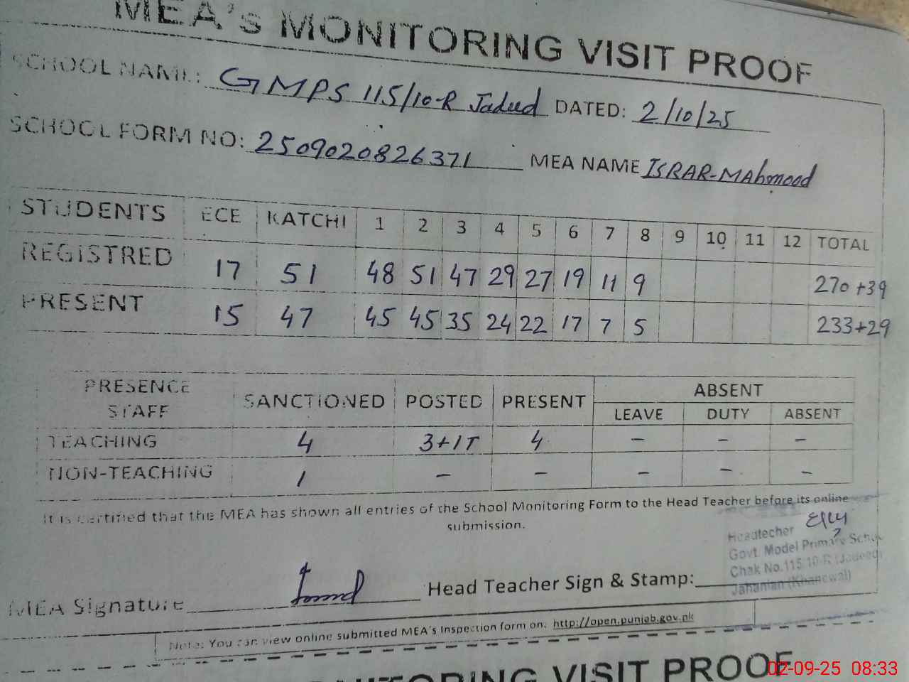 | Attendance Register | Head Teacher | MEA with School | Visit Proof |