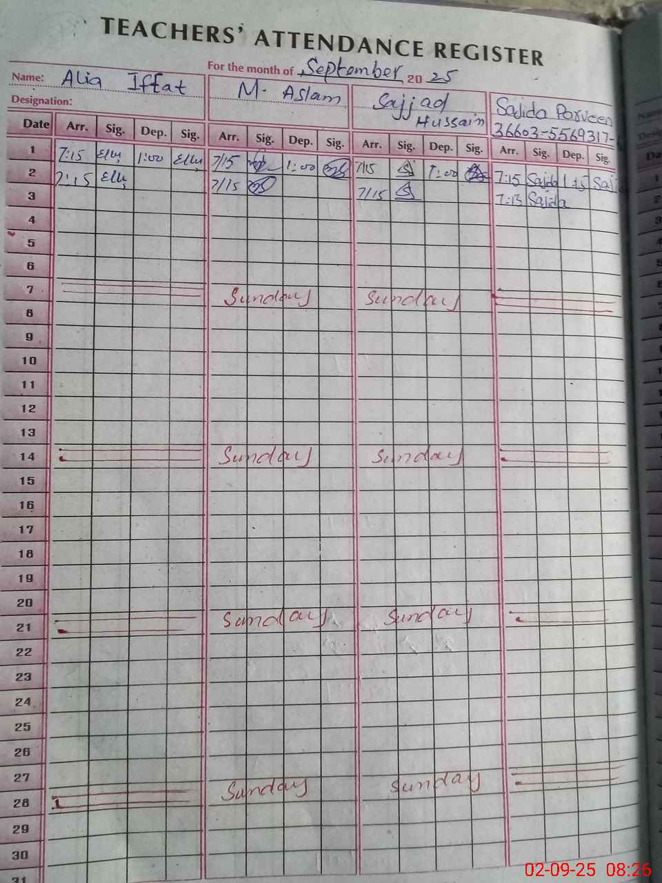 | CNIC | Full Name | Designation | R/C | Absence During Last Calender Month |