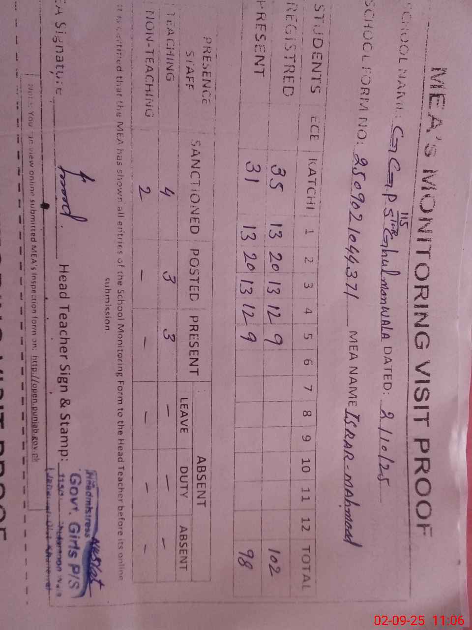 | Attendance Register | Head Teacher | MEA with School | Visit Proof |