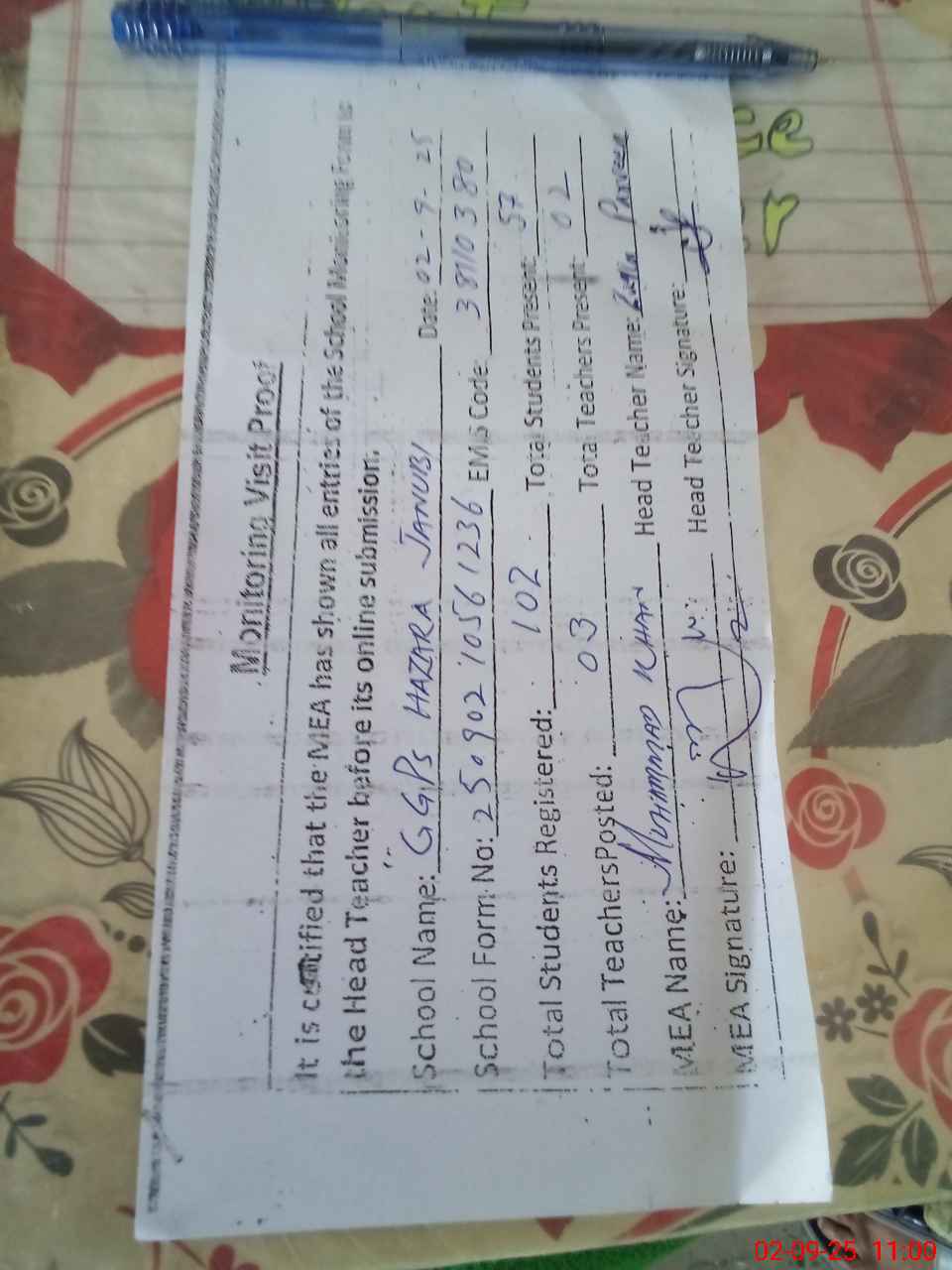 | Attendance Register | Head Teacher | MEA with School | Visit Proof |