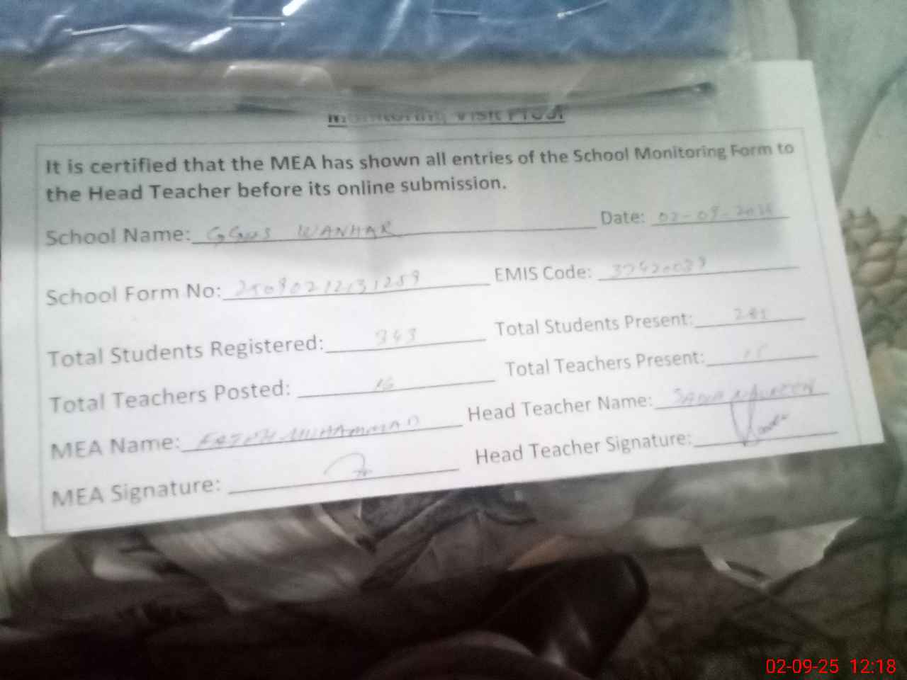 | Attendance Register | Head Teacher | MEA with School | Visit Proof |