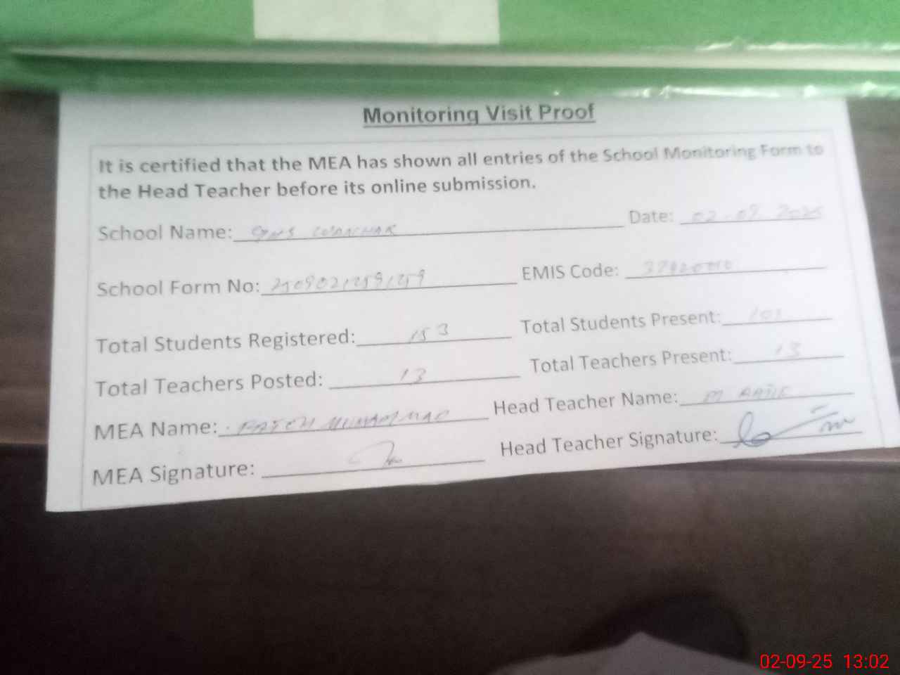 | Attendance Register | Head Teacher | MEA with School | Visit Proof |