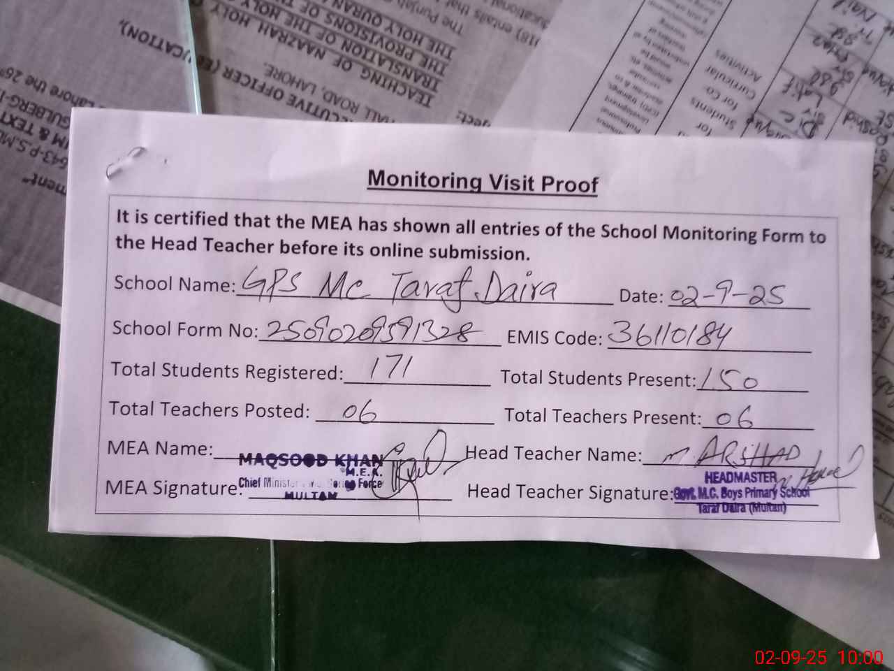 | EMIS Code: 36110184 | Name of School: GPS MC TARAF DAIRA MULTAN | |||