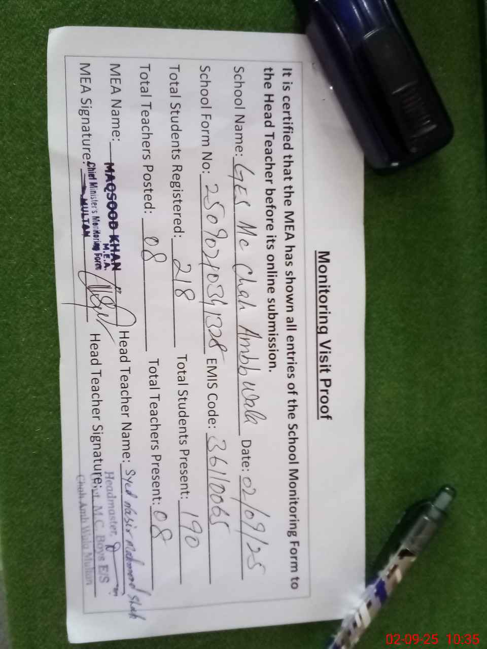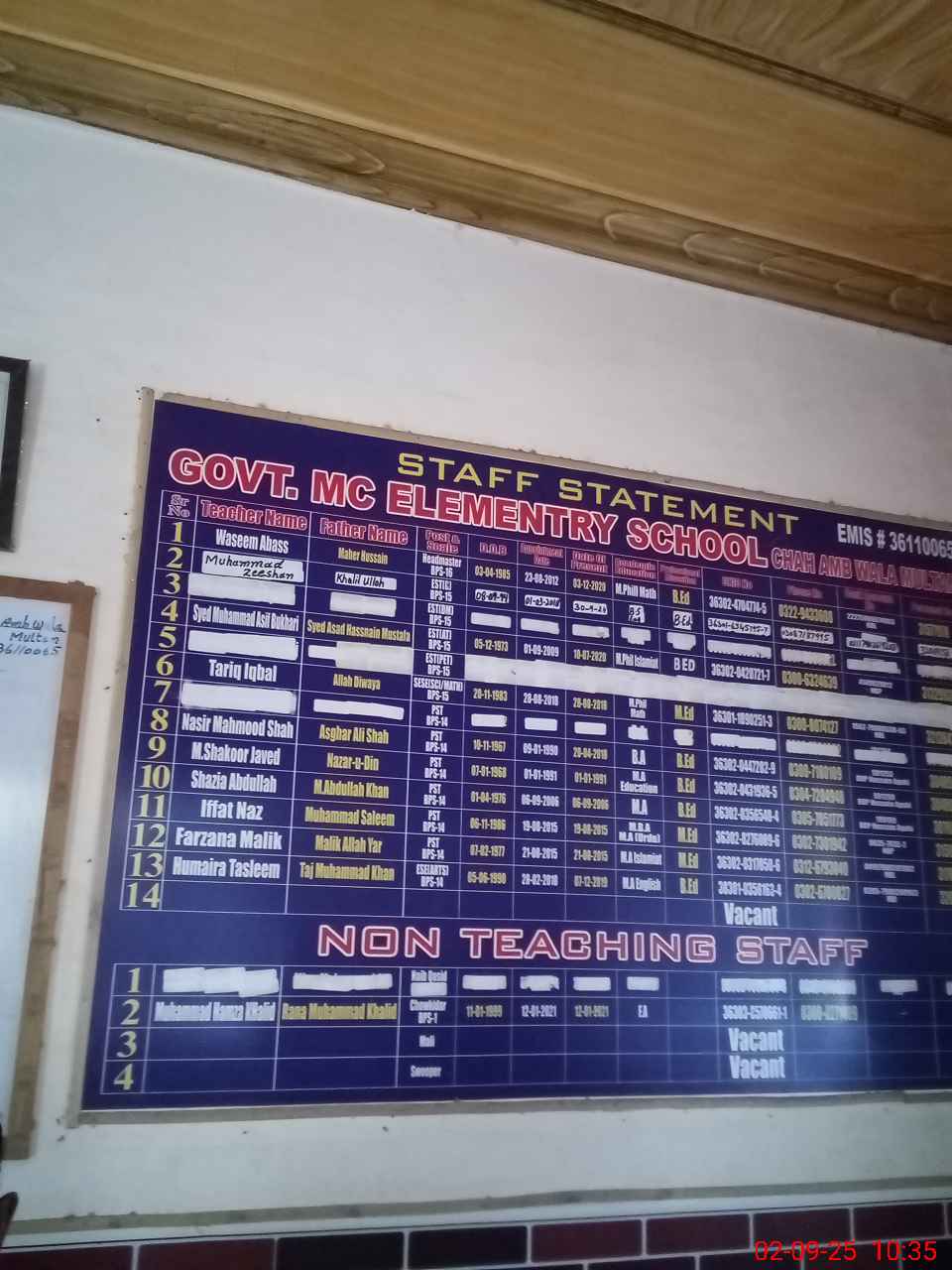 | EMIS Code: 36110065 | Name of School: GES MC CHAH AMBB WALA MULTAN | |||