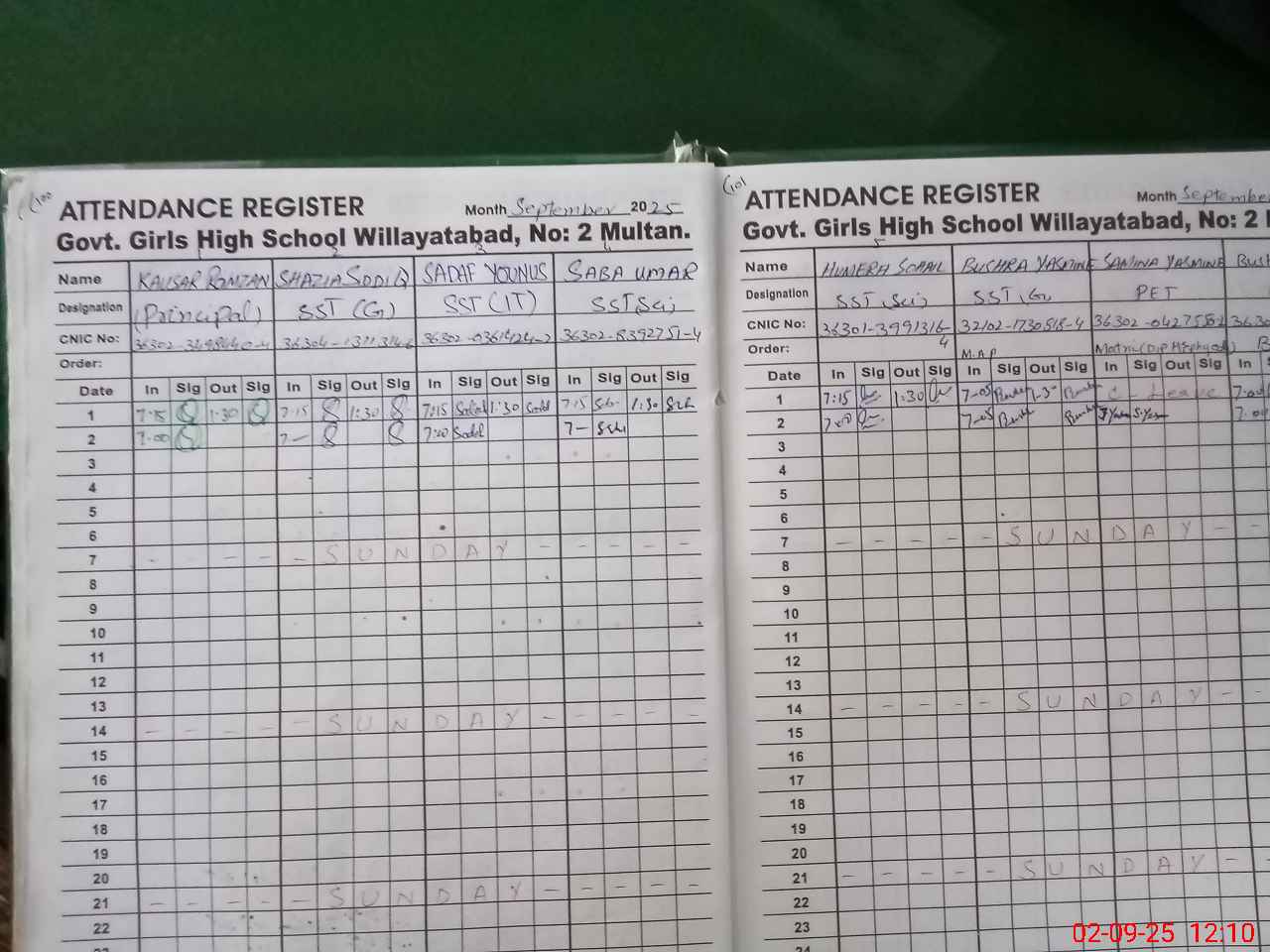 | CNIC | Full Name | Designation | R/C | Absence During Last Calender Month |