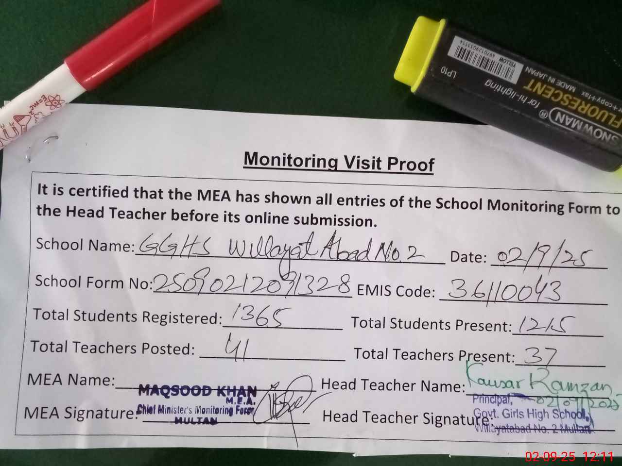 | Attendance Register | Head Teacher | MEA with School | Visit Proof |