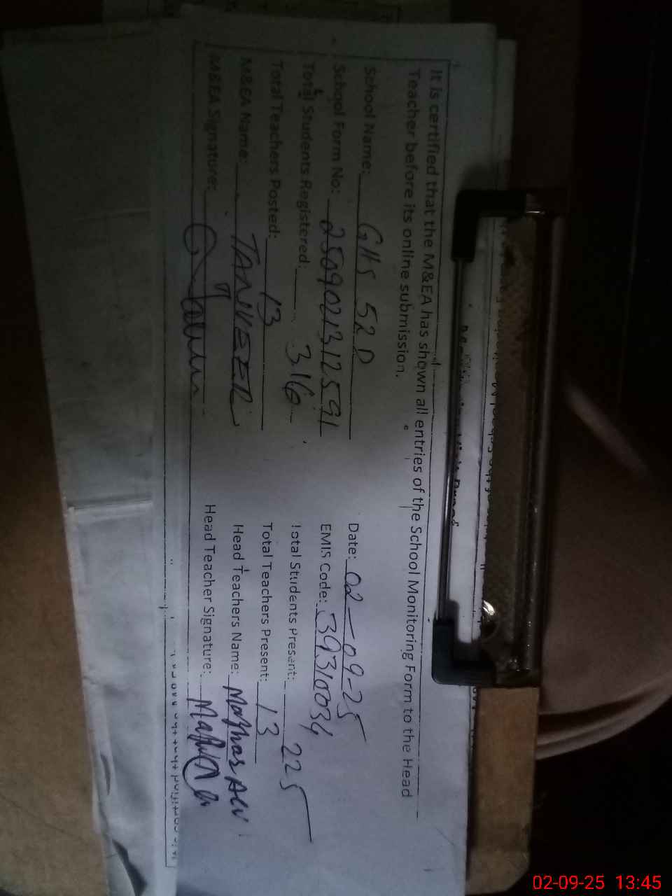 | Certified that this School was Inspected by the Undersigned MEA/DMO Today and the Information Stated Above is as Per Record. | |||||