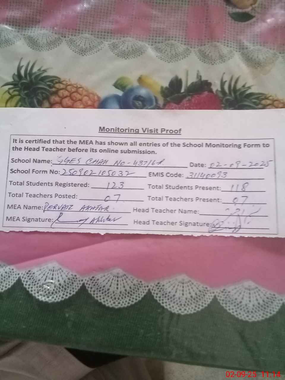 | Attendance Register | Head Teacher | MEA with School | Visit Proof |