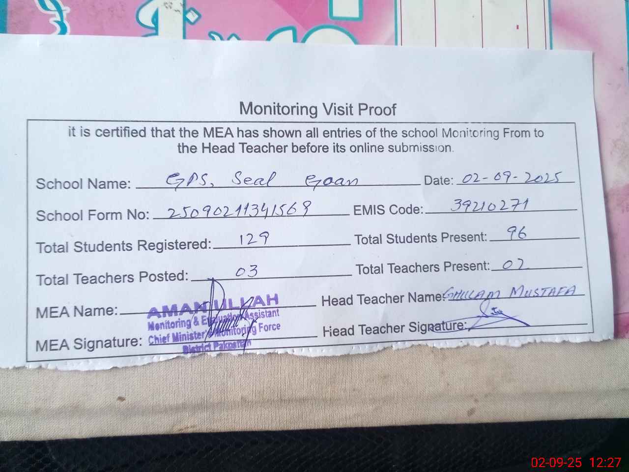 | Attendance Register | Head Teacher | MEA with School | Visit Proof |