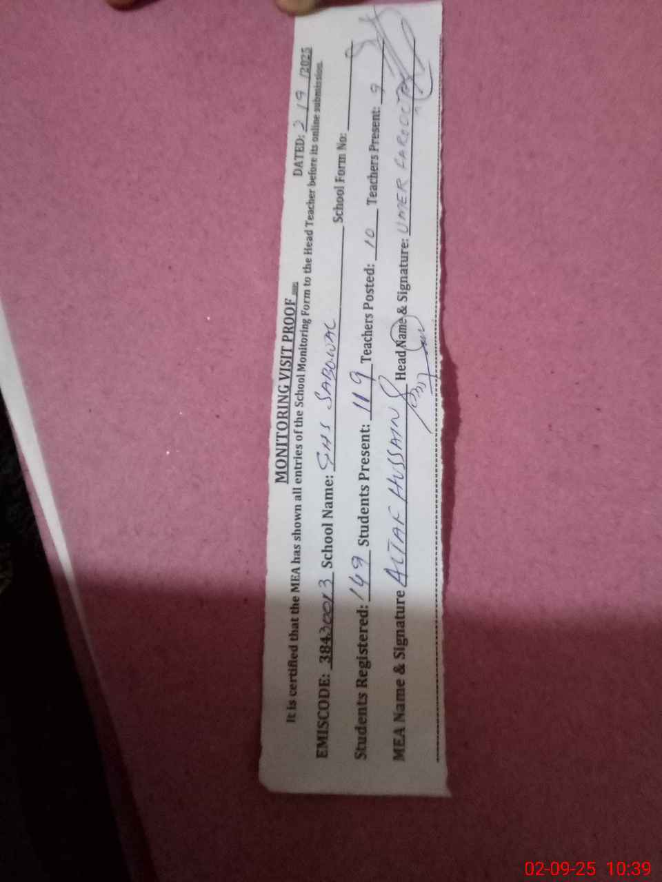 | Certified that this School was Inspected by the Undersigned MEA/DMO Today and the Information Stated Above is as Per Record. | |||||
