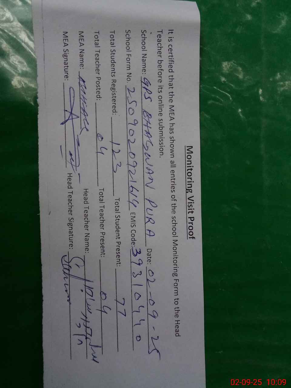 | Attendance Register | Head Teacher | MEA with School | Visit Proof |