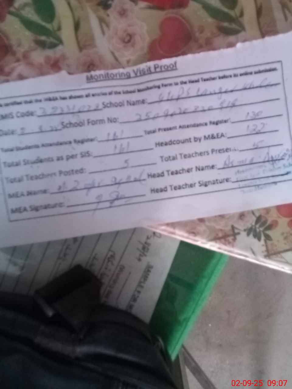 | Attendance Register | Head Teacher | MEA with School | Visit Proof |