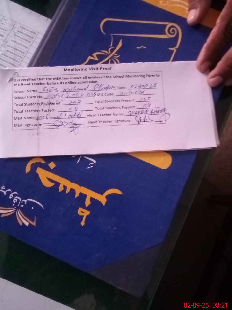 | Attendance Register | Head Teacher | MEA with School | Visit Proof |