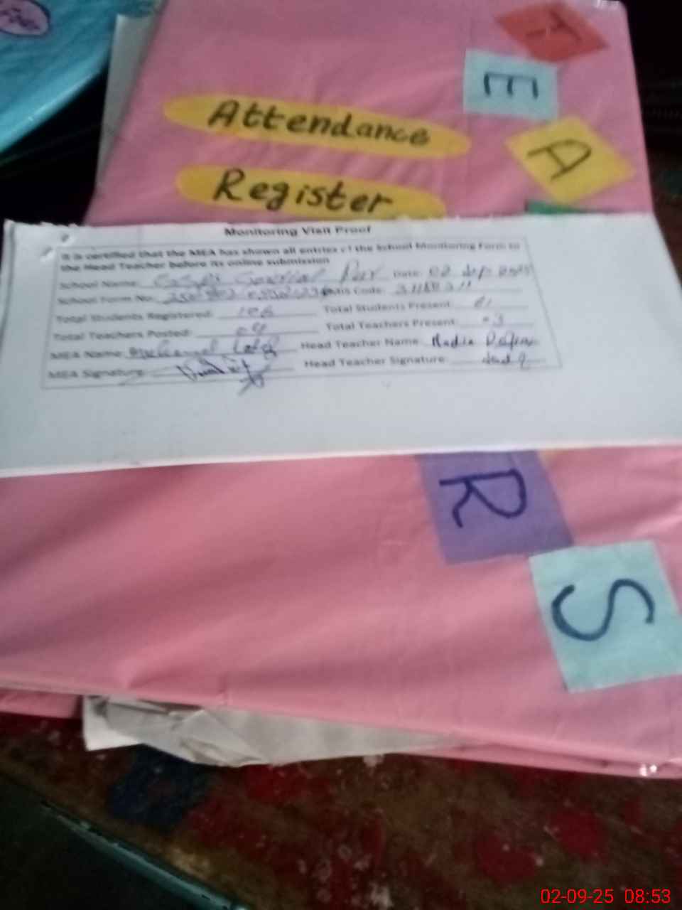 | Attendance Register | Head Teacher | MEA with School | Visit Proof |