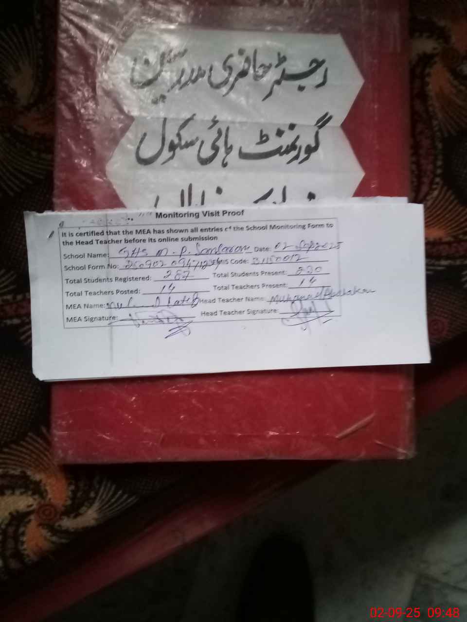 | Attendance Register | Head Teacher | MEA with School | Visit Proof |