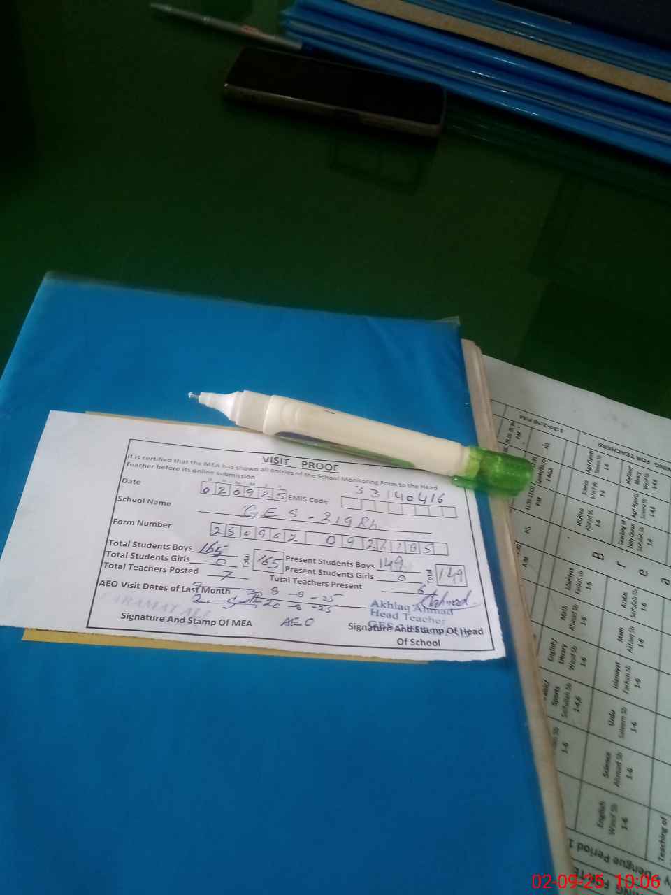 | Attendance Register | Head Teacher | MEA with School | Visit Proof |