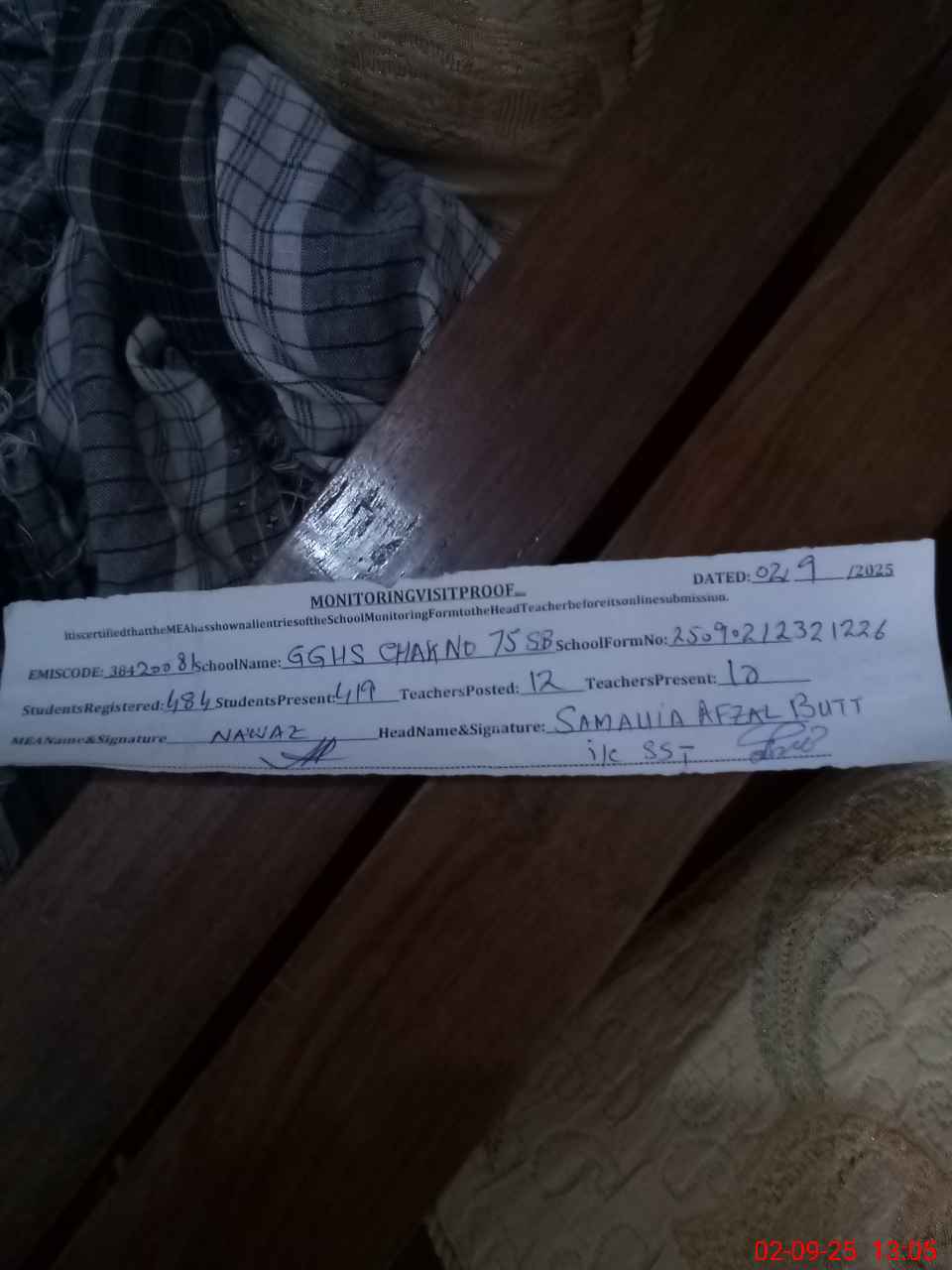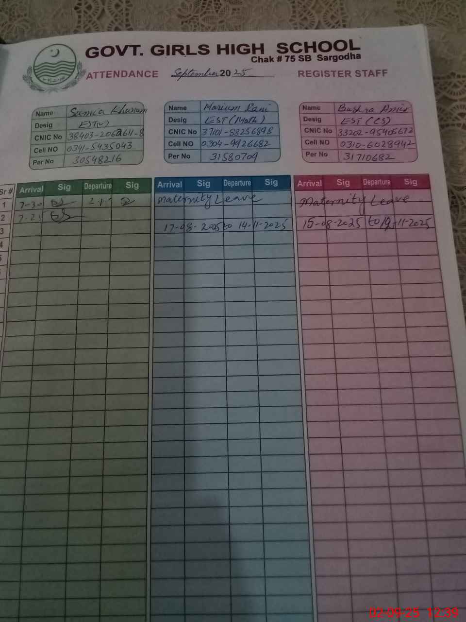 | Name: SU**** AF**** BU**** Designation: (School Headmaster's/Headmistress's) HEADMISTRESS Phone/Cell Number: 03**** |