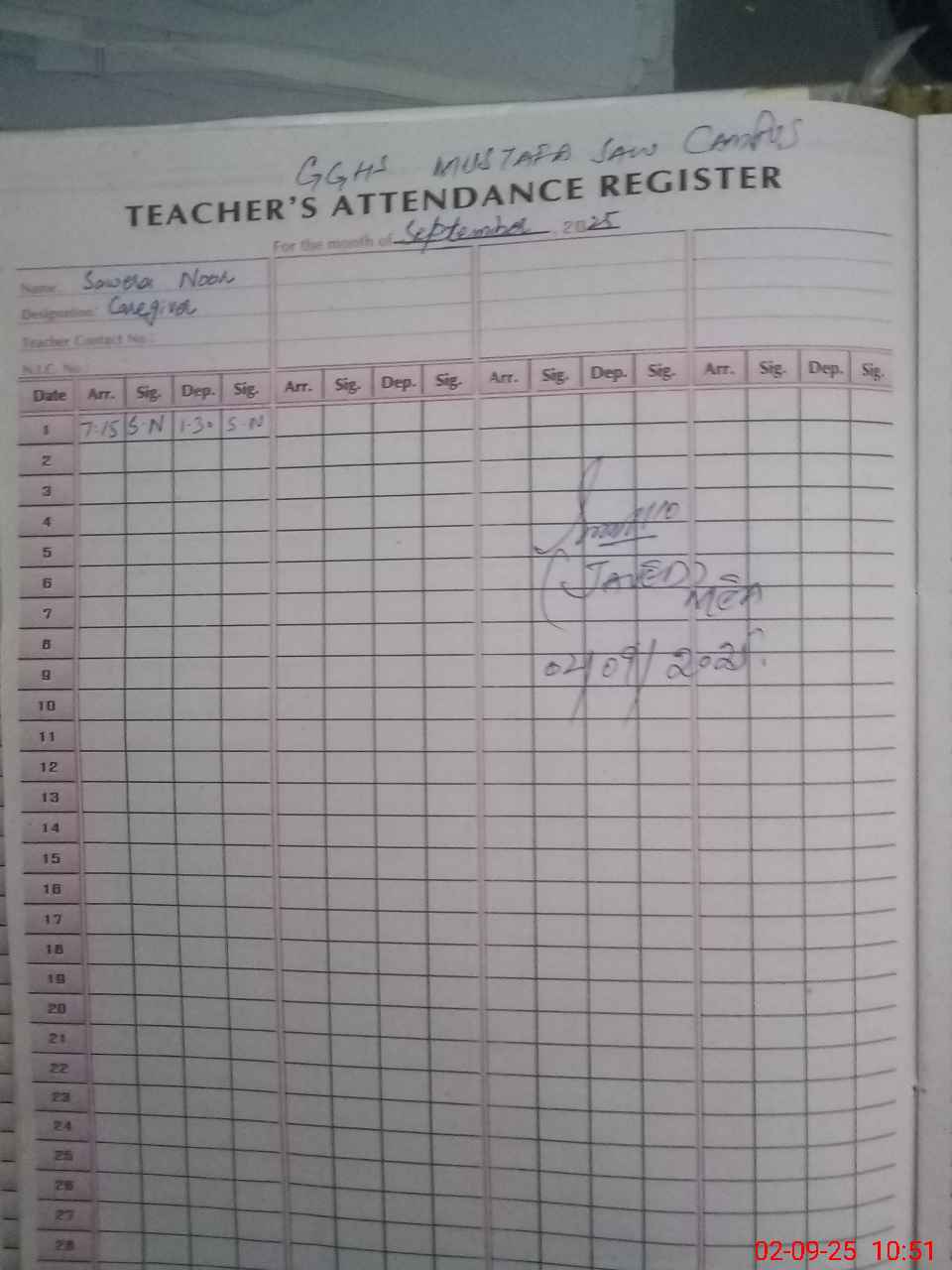 | Name: Ra**** Sa**** Designation: (School Headmaster's/Headmistress's) Incharge Phone/Cell Number: 03**** |