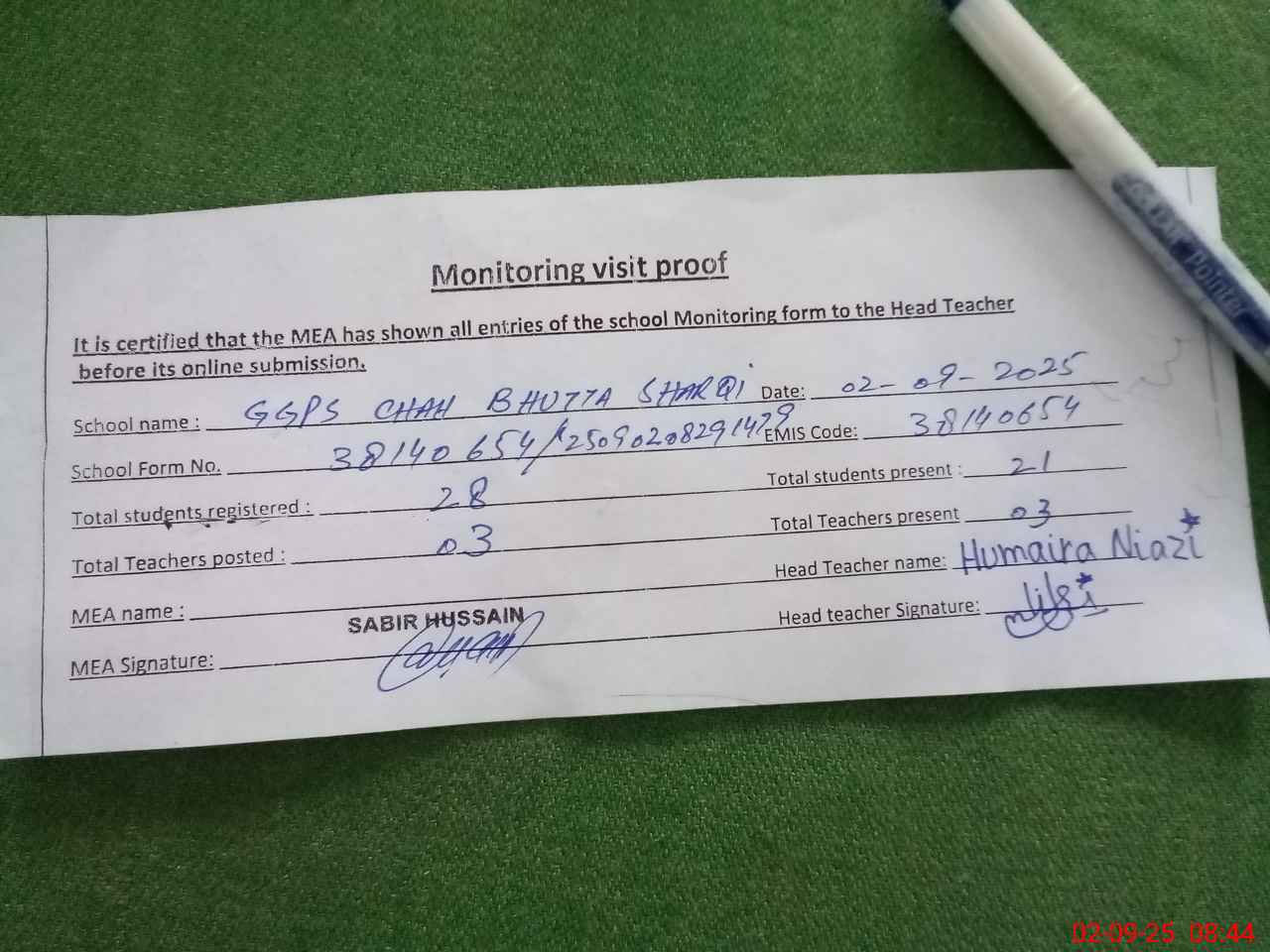 | Attendance Register | Head Teacher | MEA with School | Visit Proof |
