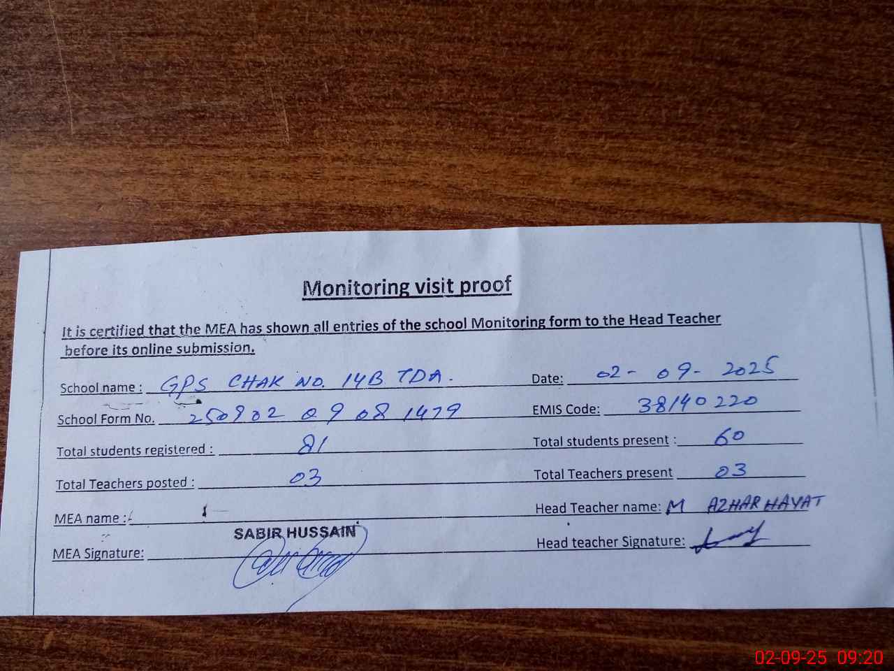 | EMIS Code: 38140220 | Name of School: GPS CHAK NO 14 B TDA | |||