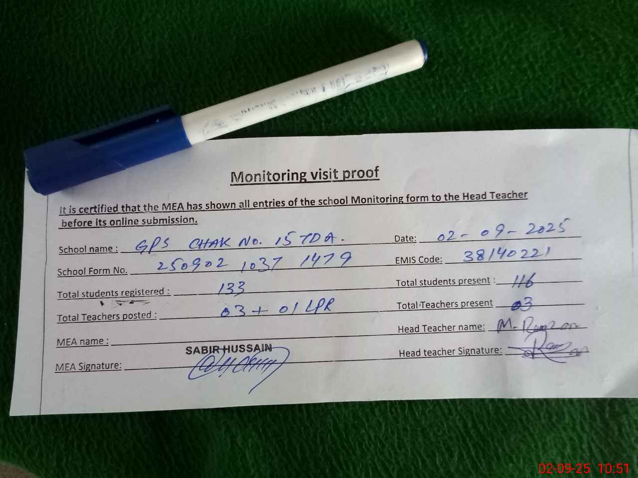 | Attendance Register | Head Teacher | MEA with School | Visit Proof |