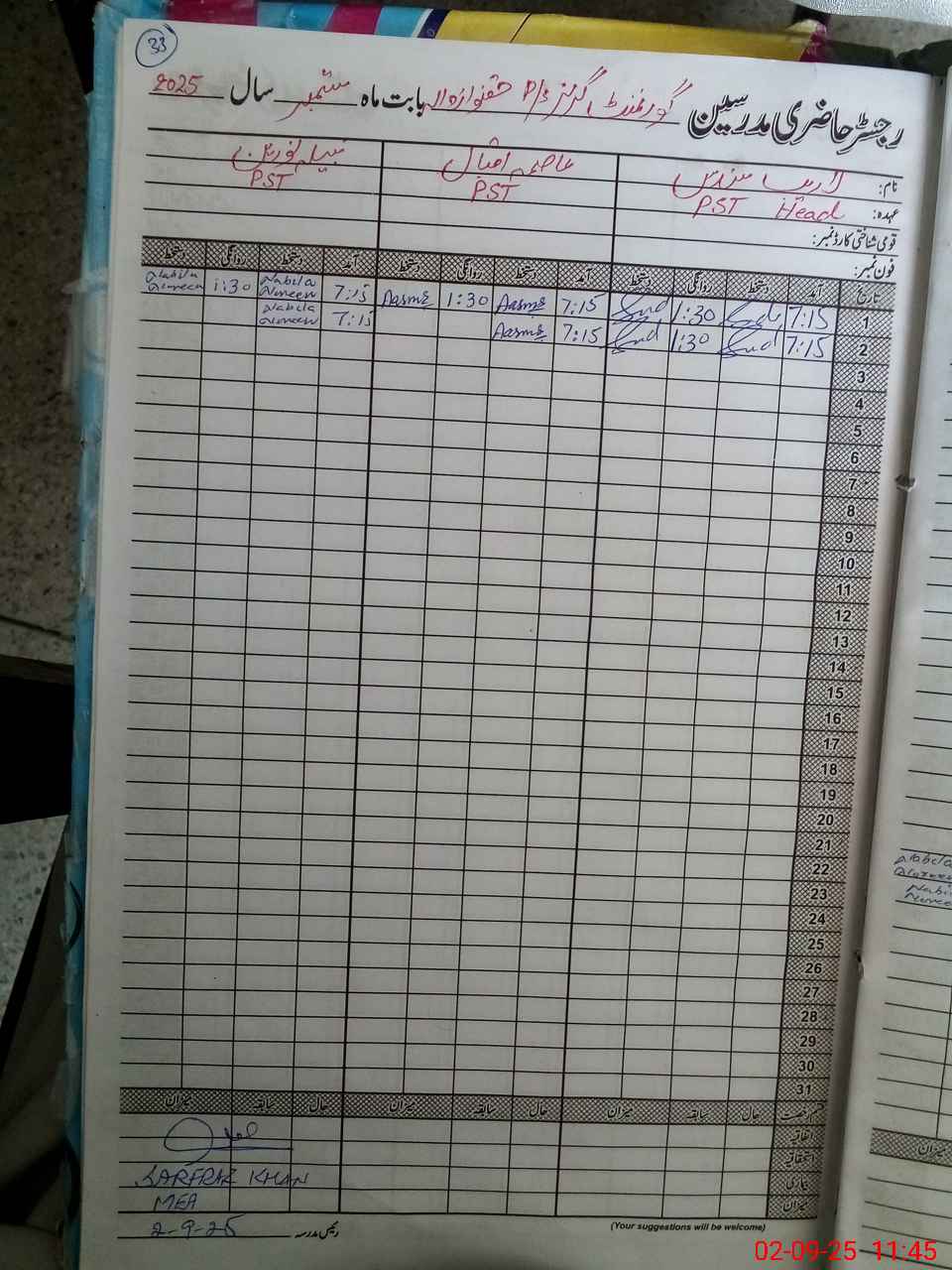 | CNIC | Full Name | Designation | R/C | Absence During Last Calender Month |