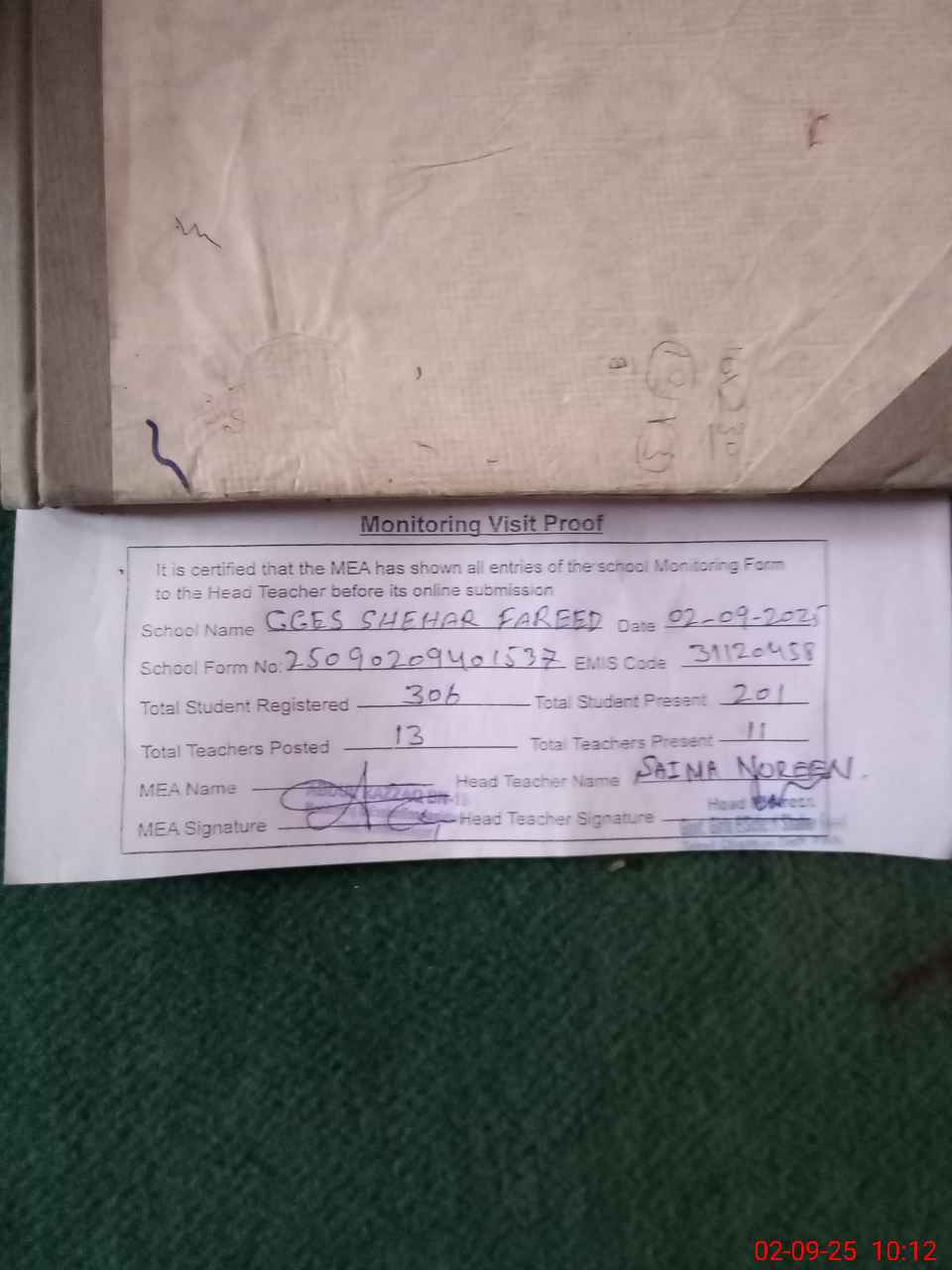 | Attendance Register | Head Teacher | MEA with School | Visit Proof |