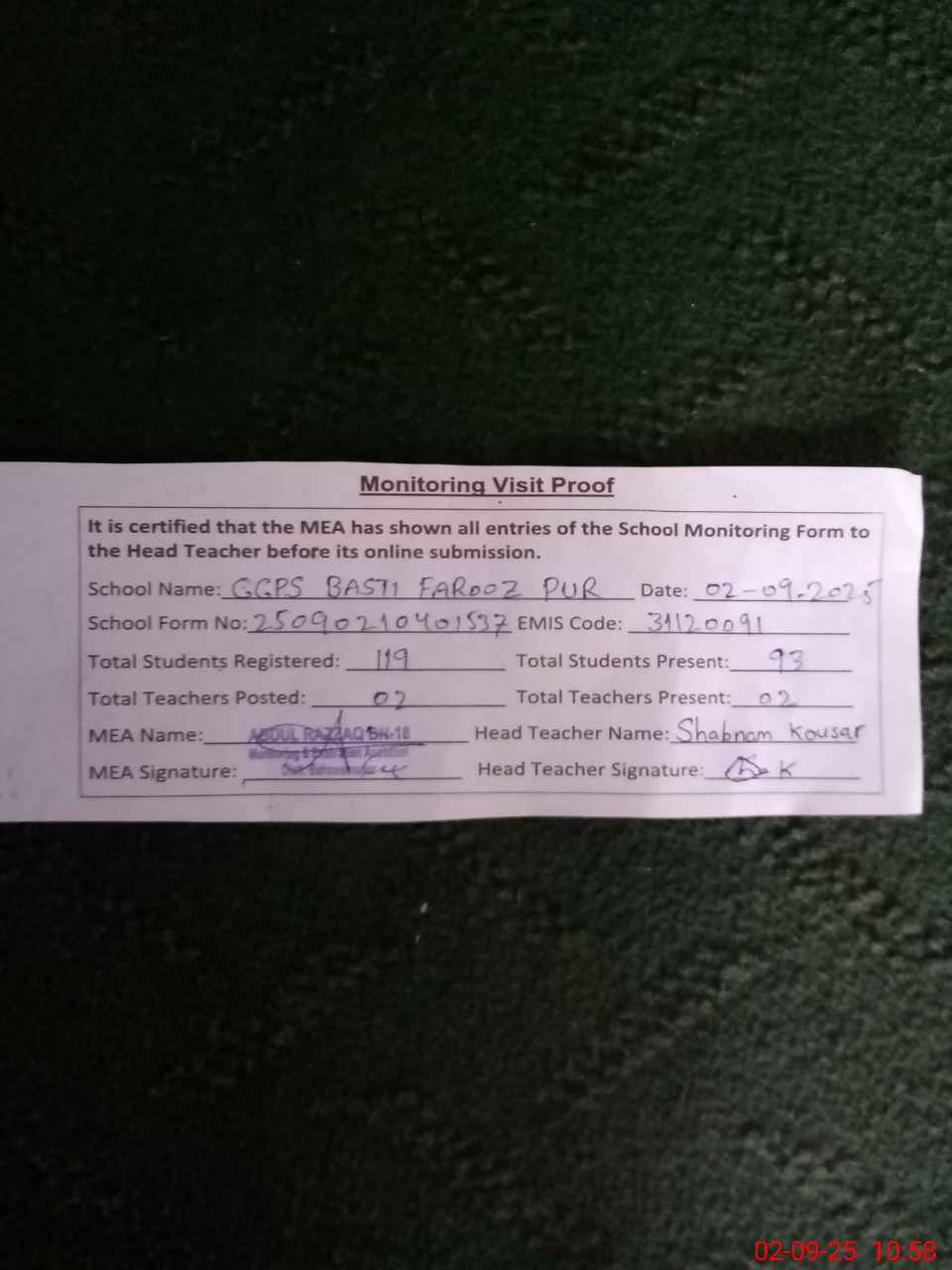 | EMIS Code: 31120091 | Name of School: GGPS BASTI FAROOZ PUR | |||
