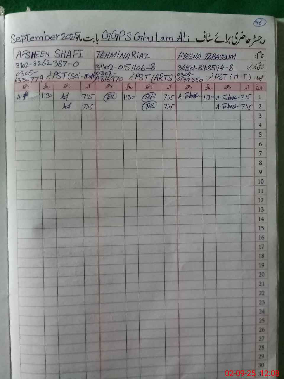 | CNIC | Full Name | Designation | R/C | Absence during last cal. month |