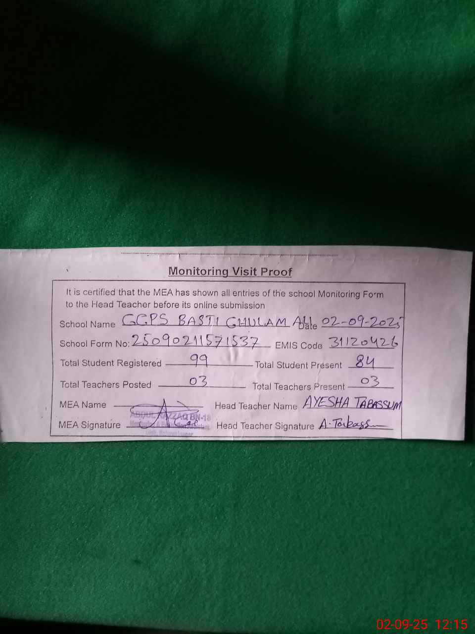 | Attendance Register | Head Teacher | MEA with School | Visit Proof |