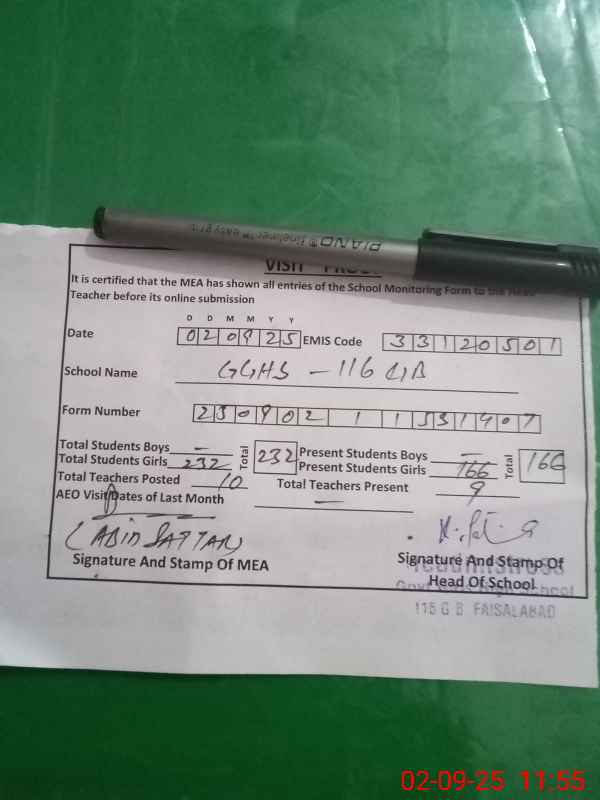 | EMIS Code: 33120501 | Name of School: GGHS CHAK 116 GB SATIANA | |||