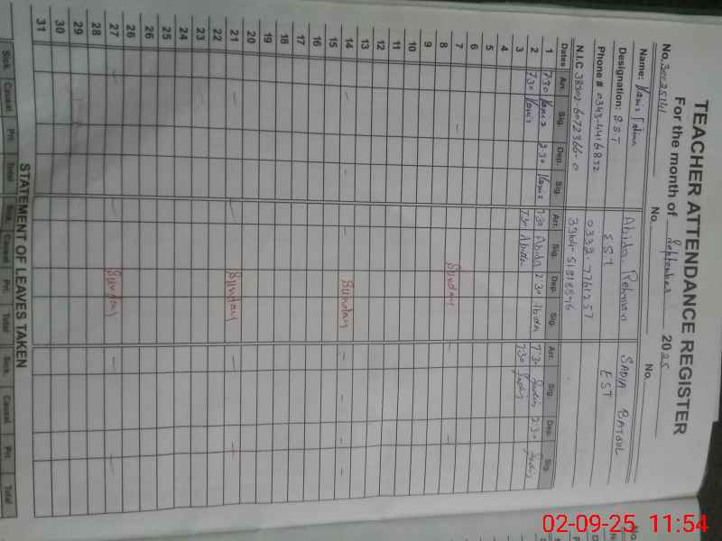 | Name: KA**** FA**** Designation: (School Headmaster's/Headmistress's) S.S.T.(ARTS) Phone/Cell Number: 03**** |