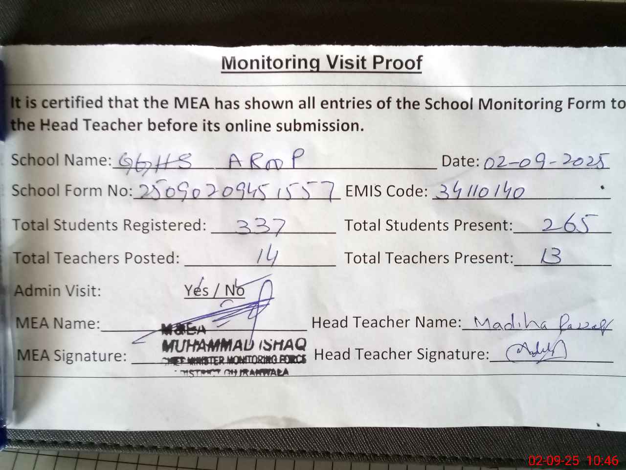 | Attendance Register | Head Teacher | MEA with School | Visit Proof |