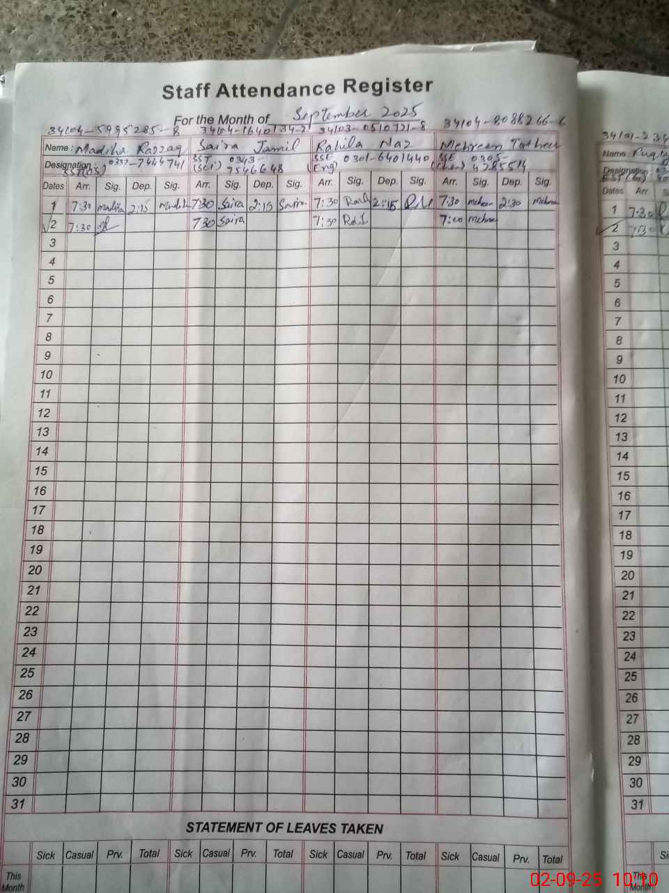 | Remarks (Use Separate Page if Required): PST SUMAIRA BOOTA AT UMERA LEAVE FROM 25 AUG 25 TO 14 SEPTEMBER 2025 leave forward on line 2 Fan is out of order in classrooms | |||||