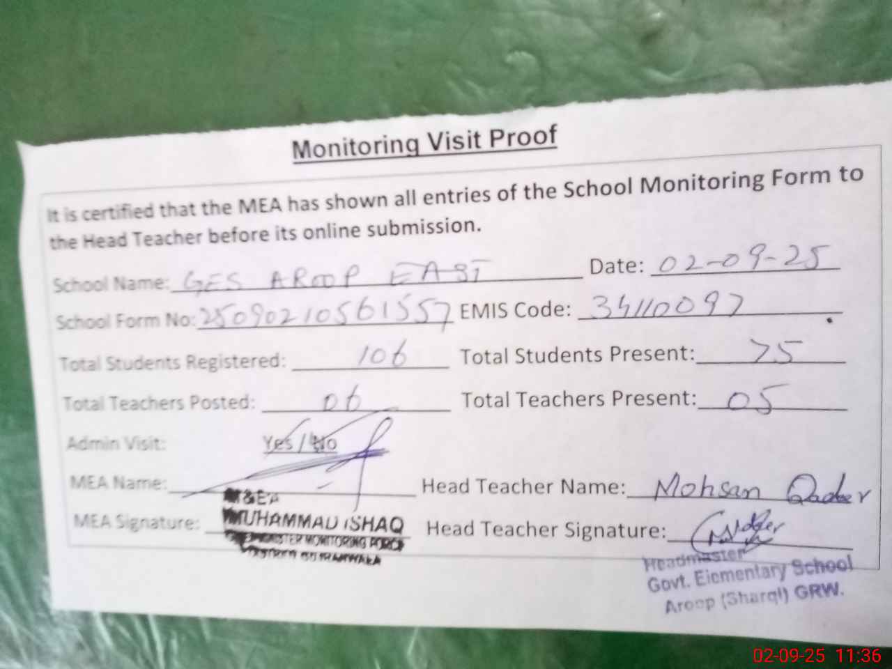 | Attendance Register | Head Teacher | MEA with School | Visit Proof |