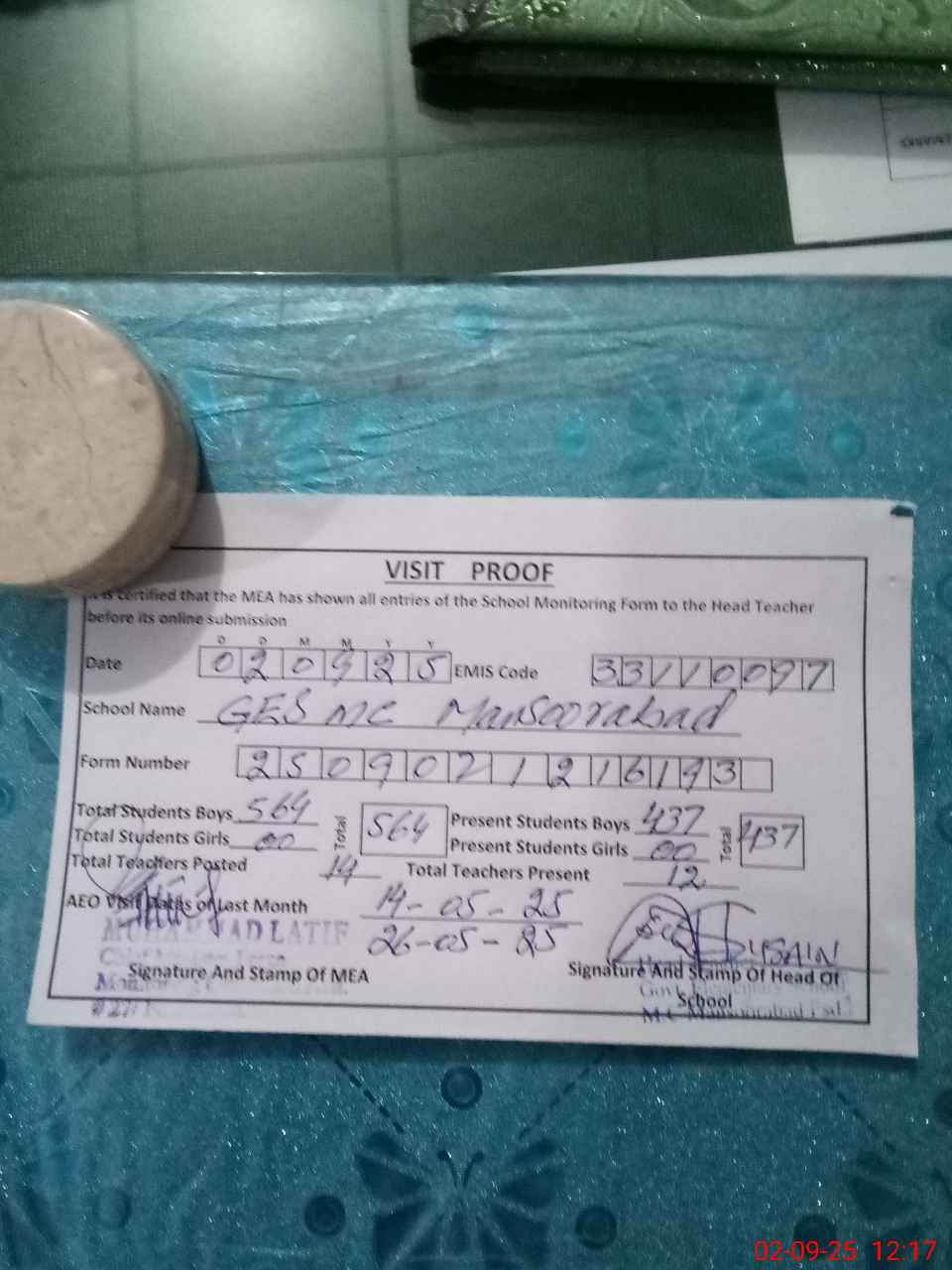 | Attendance Register | Head Teacher | MEA with School | Visit Proof |