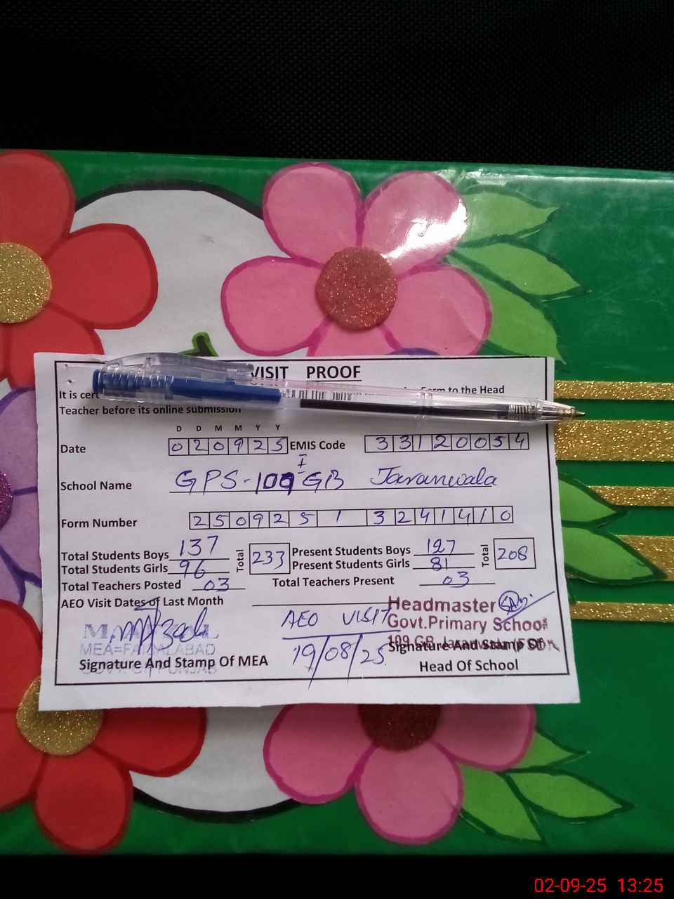 | EMIS Code: 33120054 | Name of School: GPS CHAK 109 GB I JARANWALA FSD | |||