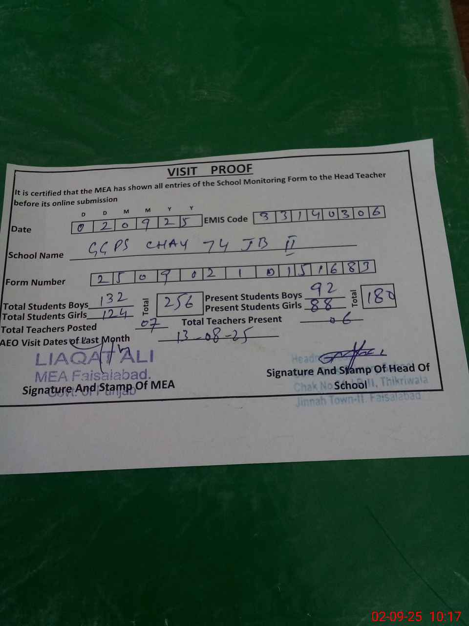 | Attendance Register | Head Teacher | MEA with School | Visit Proof |