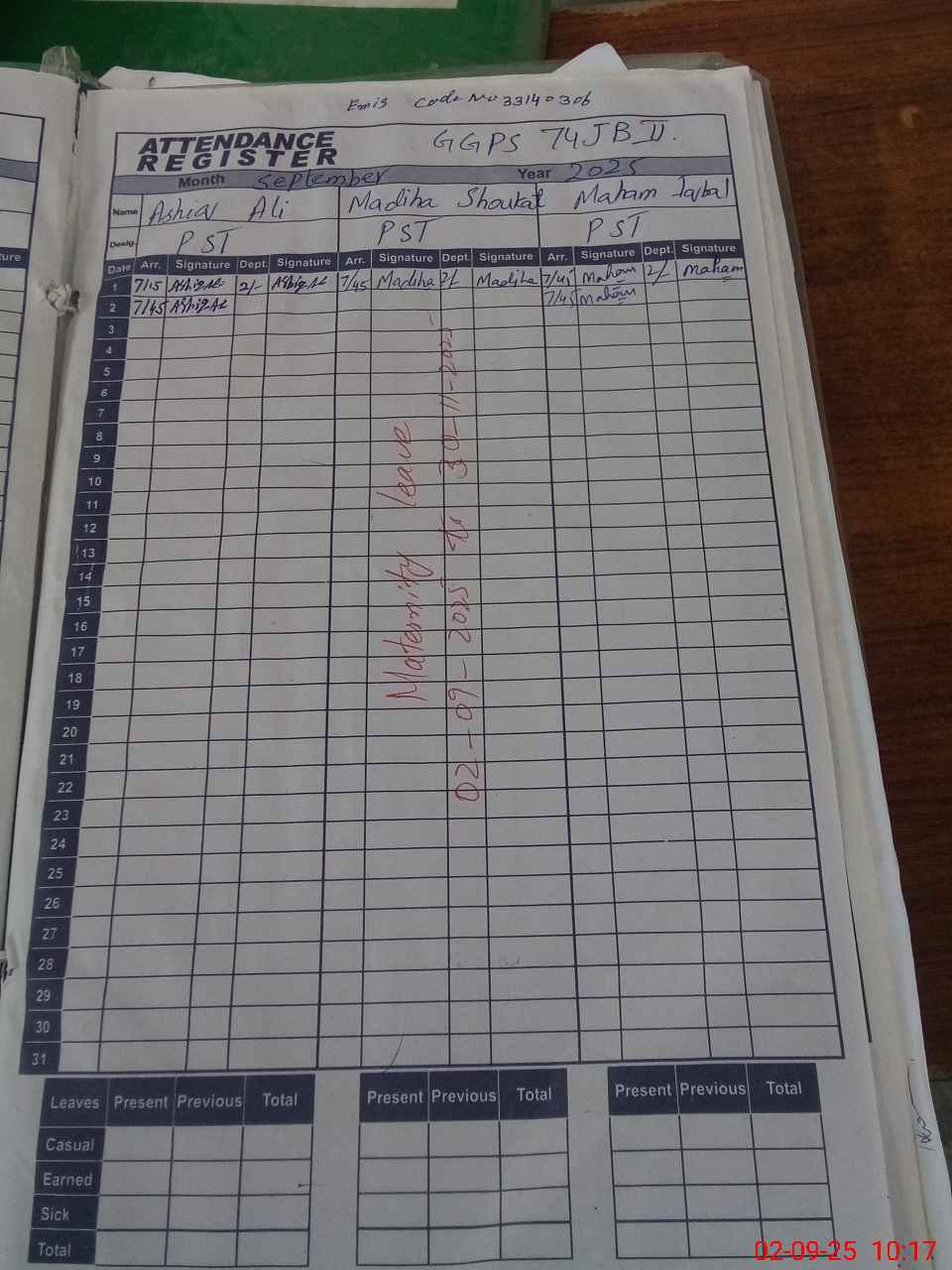 | 33**** | Ma**** Sh**** | ESE | Contract | 0 | 0 | 0 | 0 | 0 | 0 | 0 | 0 | 0 | Maternity |