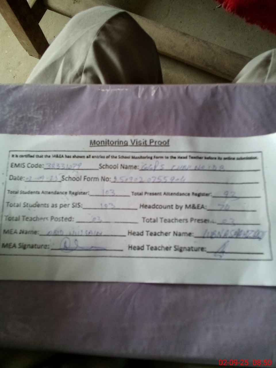 | Attendance Register | Head Teacher | MEA with School | Visit Proof |