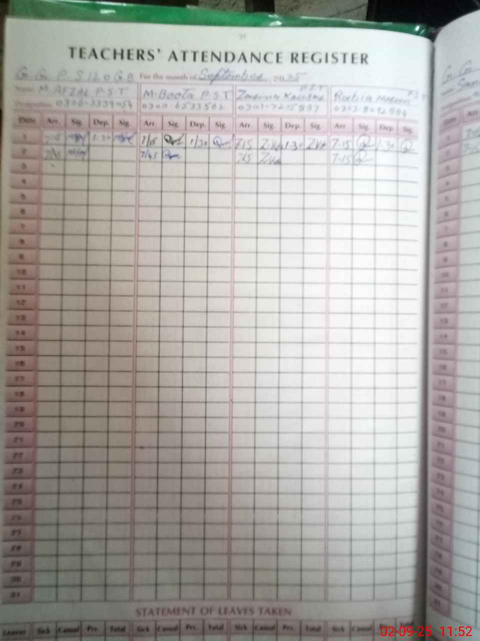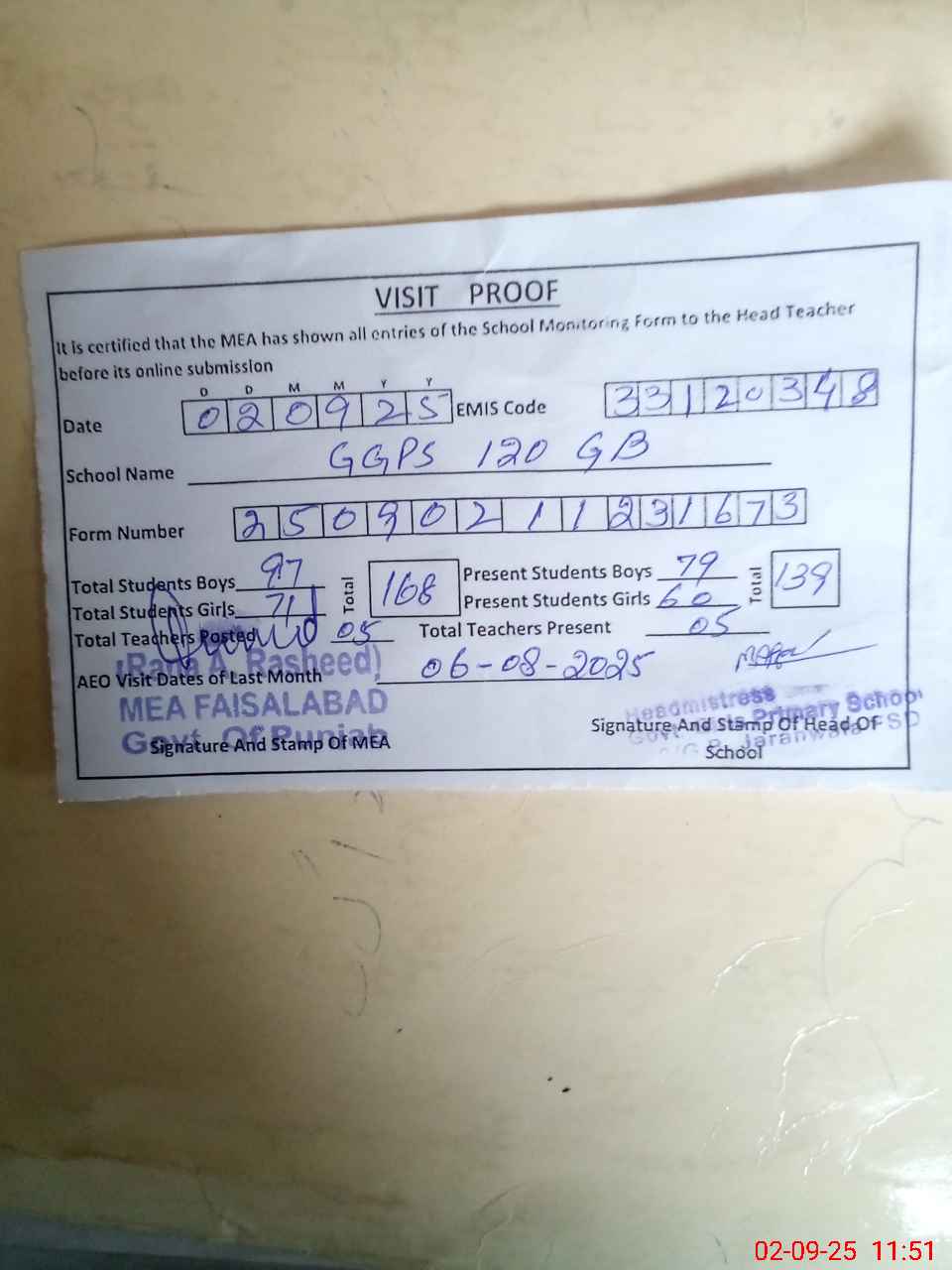 | EMIS Code: 33120348 | Name of School: GGPS CHAK 120 GB JARANWALA | |||