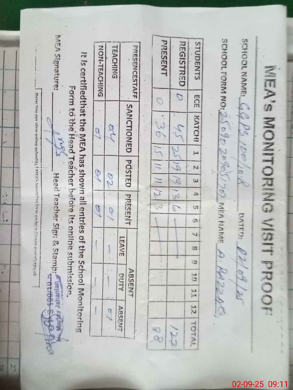 | Attendance Register | Head Teacher | MEA with School | Visit Proof |