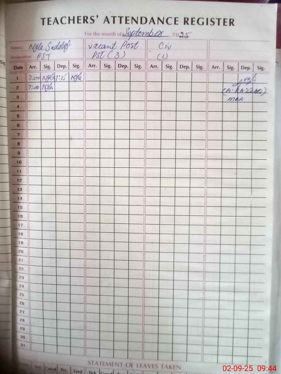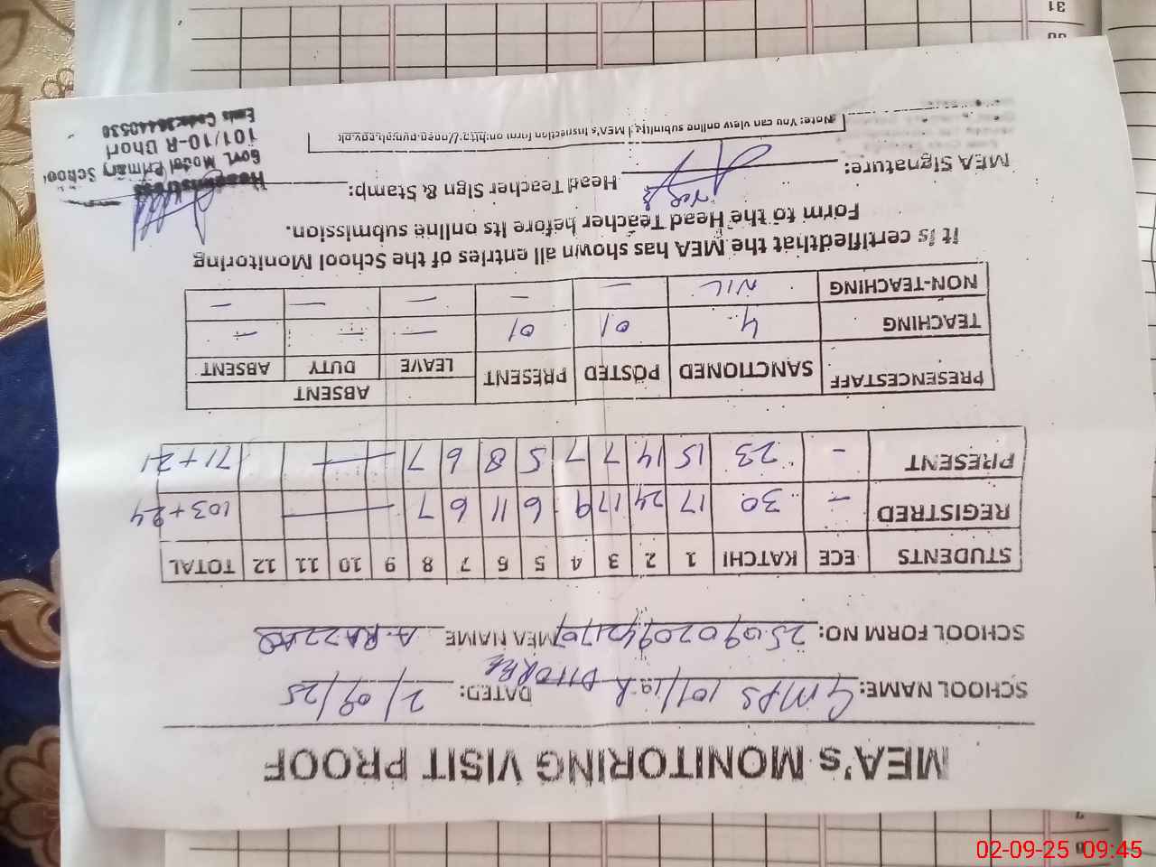 | Attendance Register | Head Teacher | MEA with School | Visit Proof |