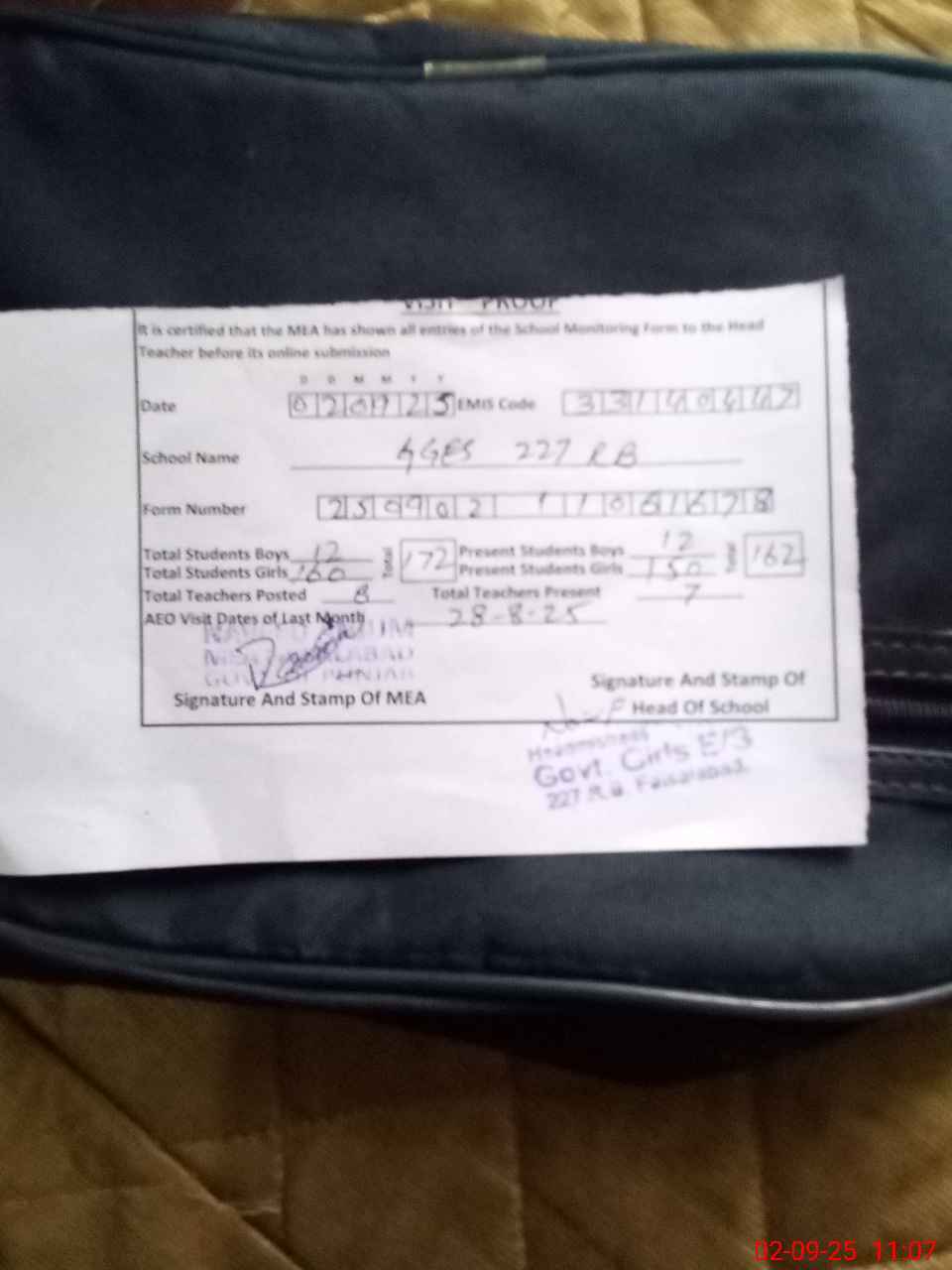 | Attendance Register | Head Teacher | MEA with School | Visit Proof |