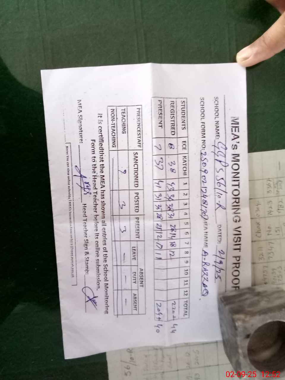 | Attendance Register | Head Teacher | MEA with School | Visit Proof |