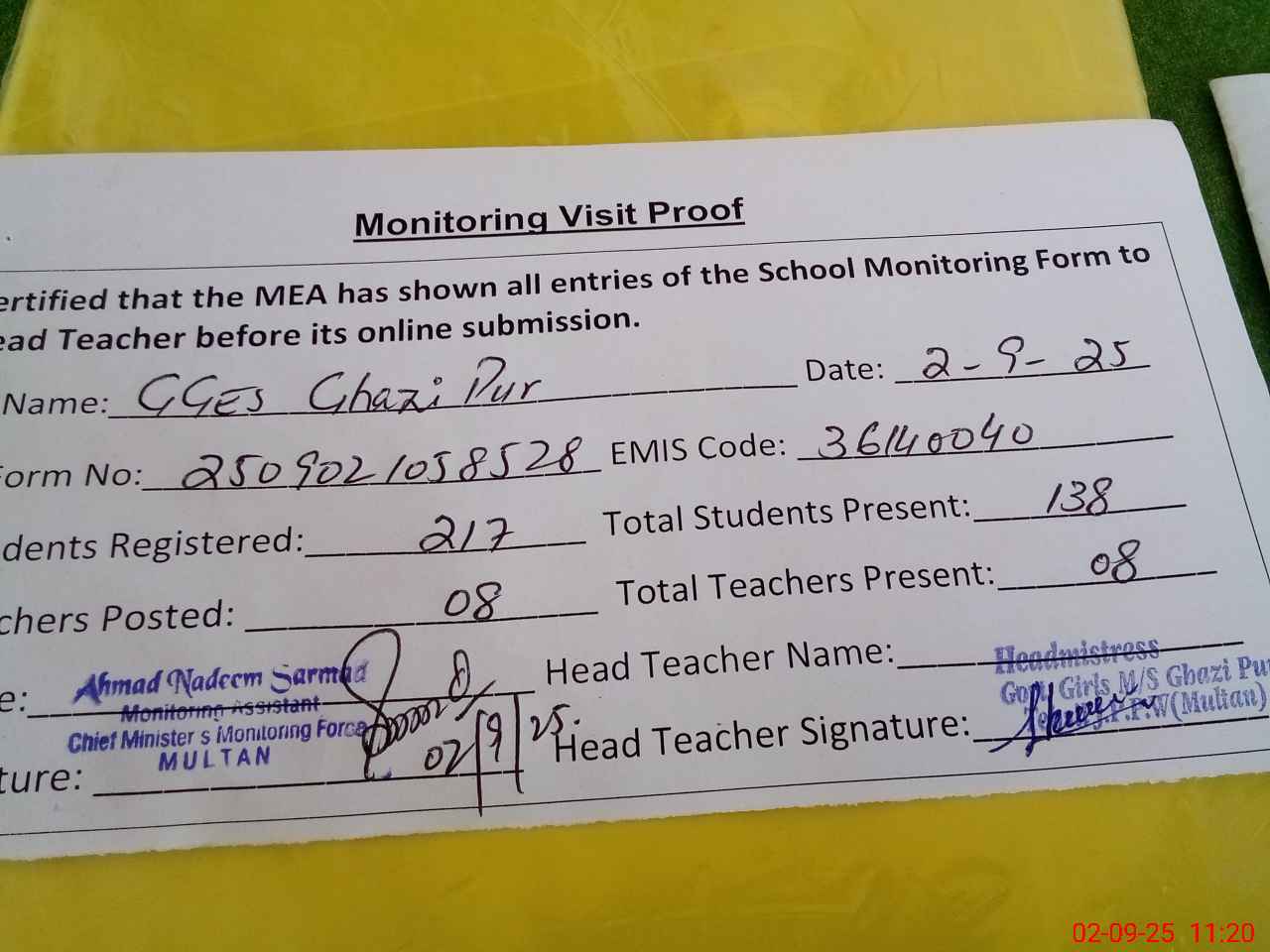| Attendance Register | Head Teacher | MEA with School | Visit Proof |