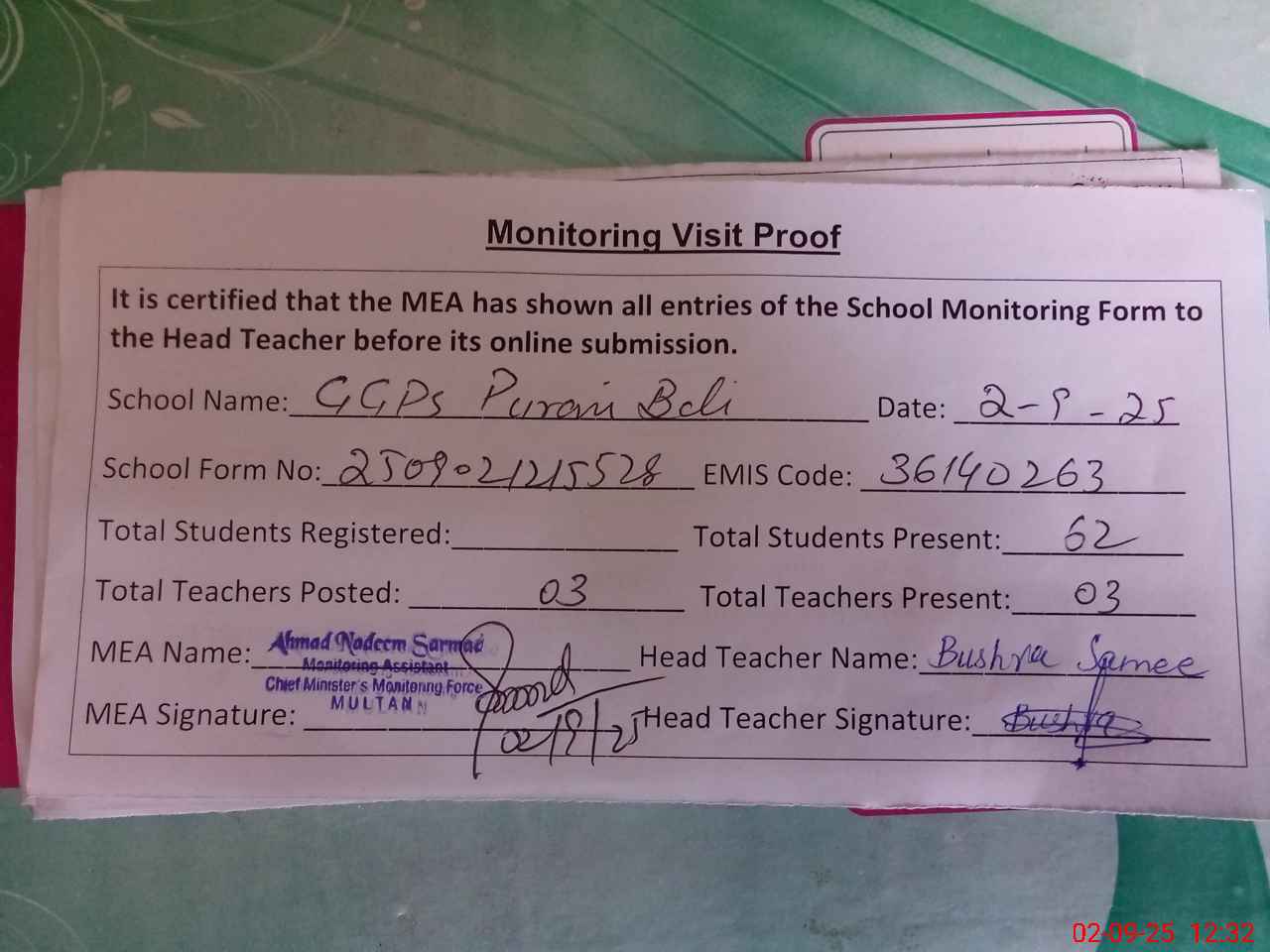 | Certified that this School was Inspected by the Undersigned MEA/DMO Today and the Information Stated Above is as Per Record. | |||||