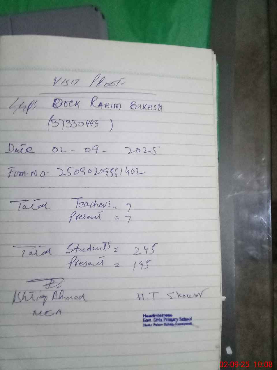 | Attendance Register | Head Teacher | MEA with School | Visit Proof |